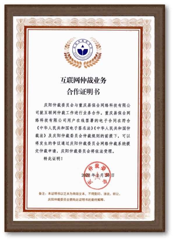 慶陽仲裁委員會(huì)合作證明書