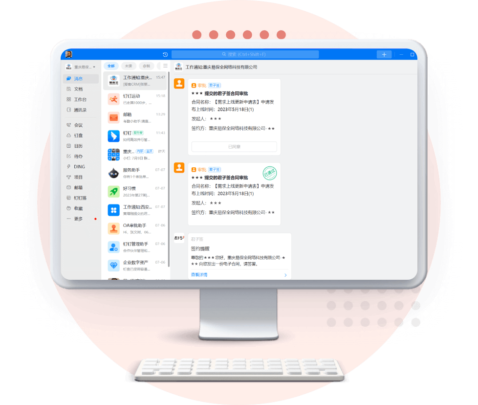 一鍵啟用,高效協(xié)同,君子簽在線電子合同簽約平臺深度融合釘釘生態(tài)加速企業(yè)數(shù)字辦公,為釘釘用戶提供便捷高效、安全有效的電子合同服務(wù)
